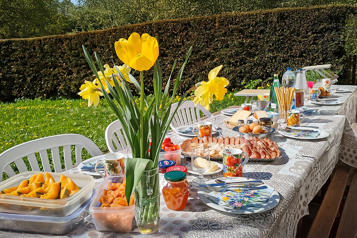 - ampio terrazzo che da sul prato e si affaccia al giardino con stupenda vista sulle dolomiti.